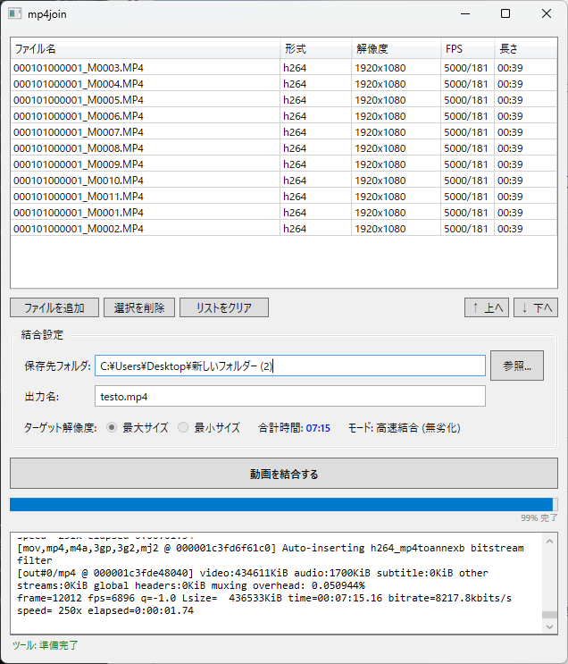 このソフトは、mp4の動画ファイルをffmpegを使用して一つに繋げることができるシンプルなツールです。